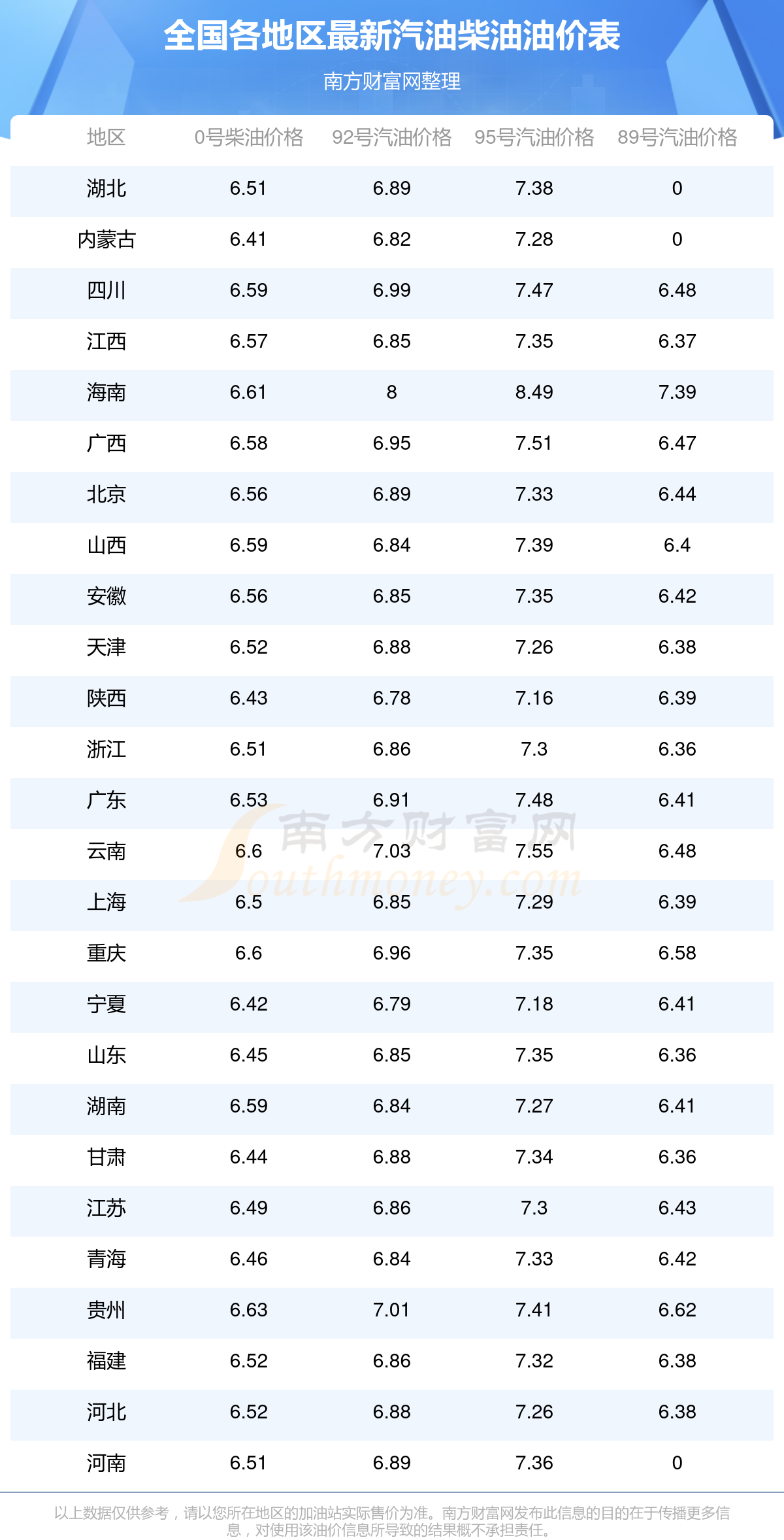 油价数据仅供参考,请以您所在地区的加油站报价为准。南方财富网发布此信息的目的在于传播更多信息,对使用该油价信息所导致的结果概不承担任何责任。