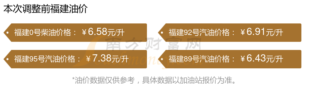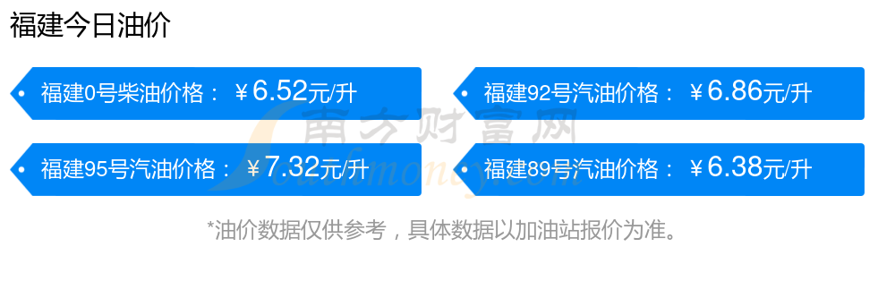 12月7日福建汽油、柴油每升的价格具体为:本轮油价调整时间为11月25日,92号汽油是6.86元,降了0.05元,降幅达0.72%;95号汽油是7.32元,降了0.06元,降幅达0.81%;89号汽油为6.38元,降了0.05元,降幅达0.78%;0号柴油为6.52元,降了0.06元,降幅达0.91%。