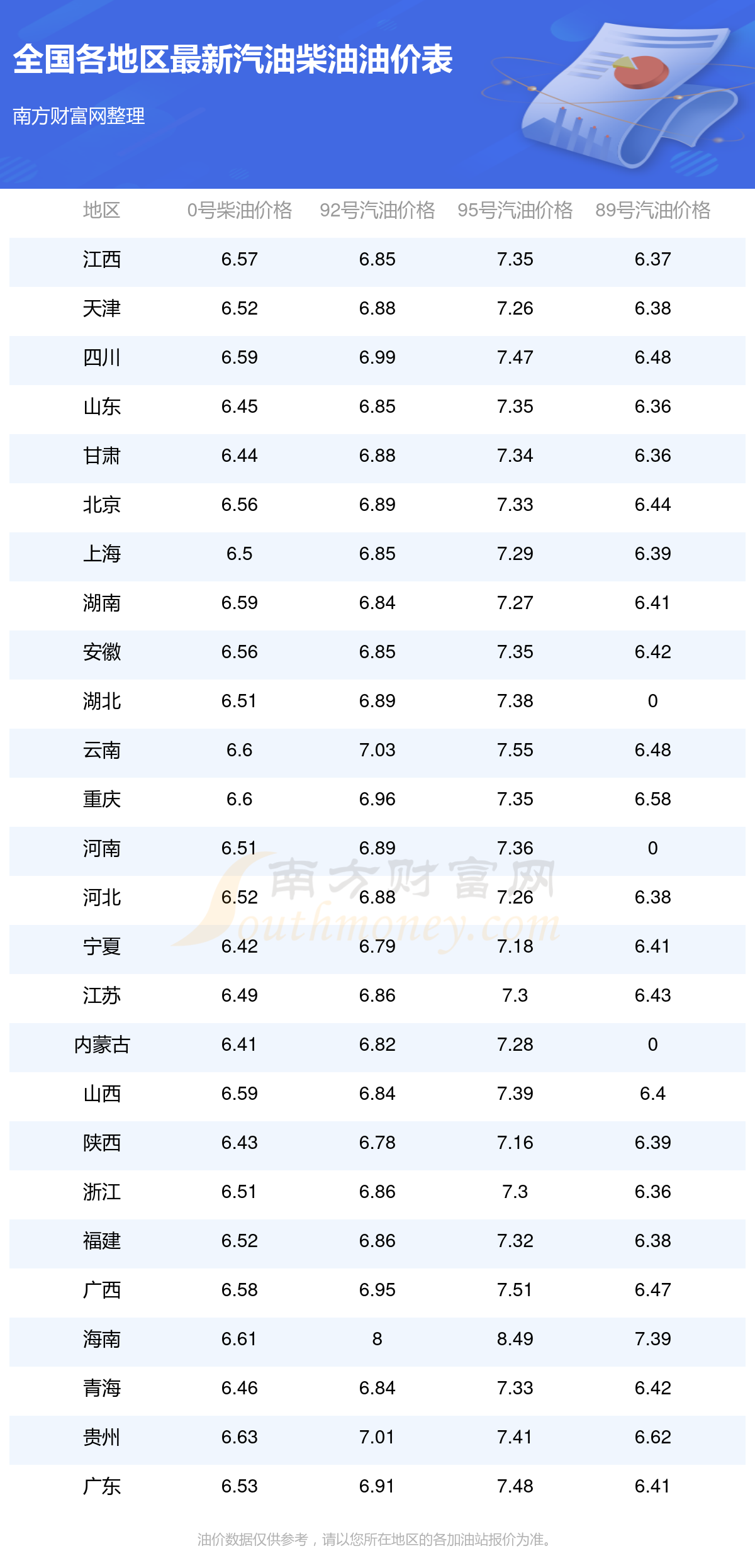 以上数据仅供参考,请以您所在地区的加油站实际售价为准。南方财富网发布此信息的目的在于传播更多信息,对使用该油价信息所导致的结果概不承担责任。