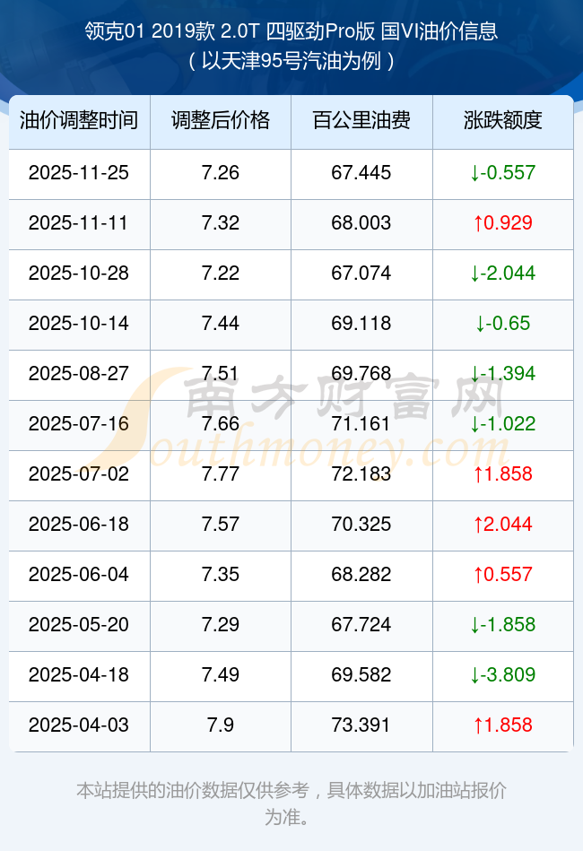 按照11月25日95号汽油最新调整价格7.26元/升来计算(以天津为例),该车型百公里平均油费为67.445元,按照上一轮11月11日调整价格7.32元/升来计算,百公里平均油费为68.003元,对比上一轮少花0.557元,下一轮油价调整时间为12月8日24时。