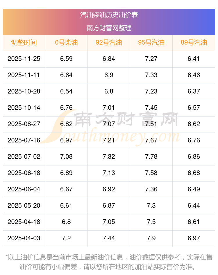 2025年95号汽油价格一览表