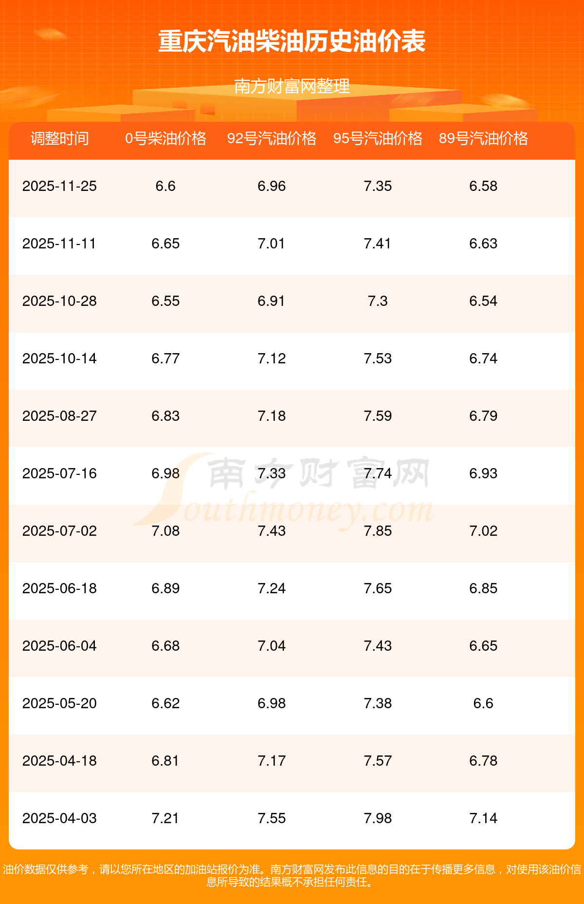 汽油价格调整最新消息:下一轮油价调整时间12月8日24时。12月7日重庆汽油、柴油的价格多少钱一升?本轮油价调整时间是11月25日,92号汽油6.96元,下调了0.05元,下调幅达0.71%;95号汽油7.35元,下调了0.06元,下调幅达0.81%;89号汽油6.58元,下调了0.05元,下调幅达0.75%;0号柴油6.6元,下调了0.05元,下调幅达0.75%。