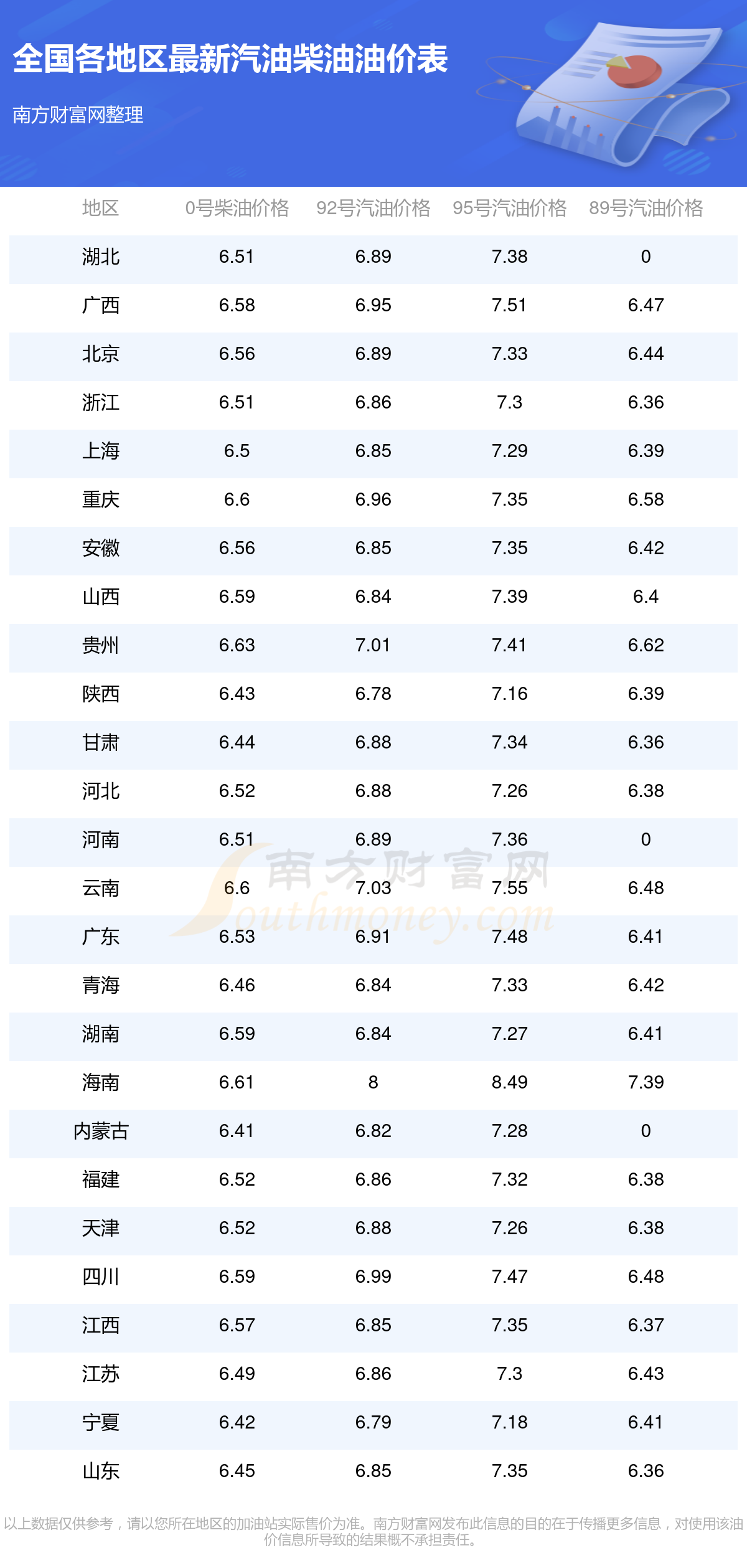 油价数据仅供参考,请以您所在地区的加油站报价为准。南方财富网发布此信息的目的在于传播更多信息,对使用该油价信息所导致的结果概不承担任何责任。