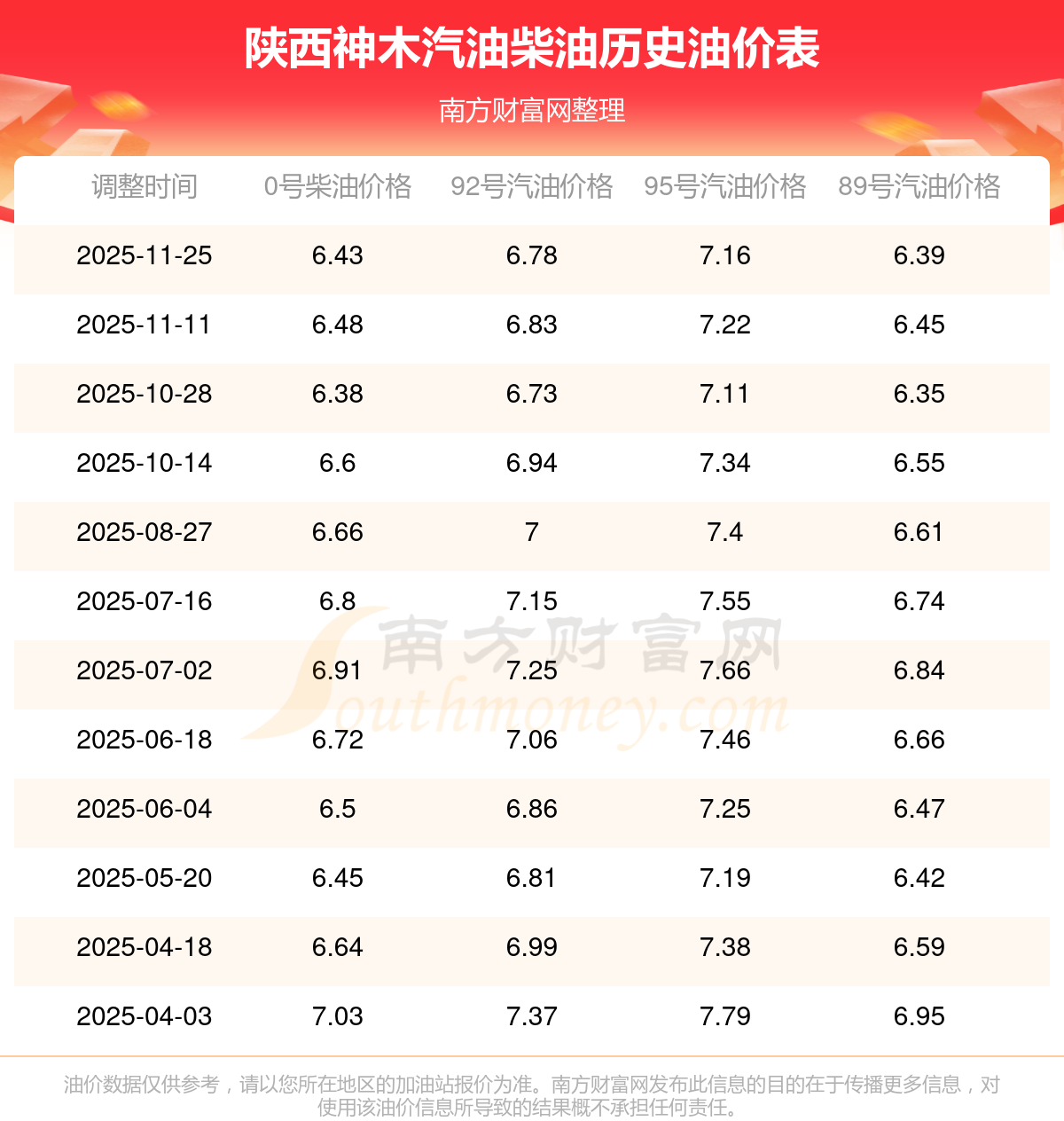 陕西神木汽油、柴油12月7日每升的价格是多少?11月25日调整后的价格详情如下:92号汽油6.78元;95号汽油7.16元;89号汽油6.39元;0号柴油6.43元。
