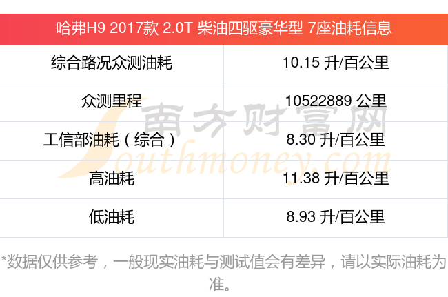 根据多位车主实测得出数据,该车型低油耗为8.93L/100km,高油耗为11.38L/100km,综合路况众测油耗为10.15L/100km,工信部综合油耗为8.30L/100km。