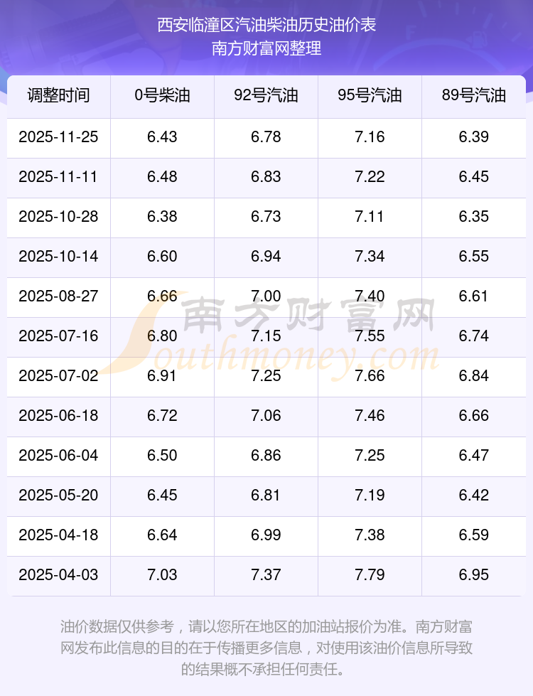 油价调整最新消息:下一轮油价调整时间12月8日24时。西安临潼区汽油、柴油12月7日价格多少钱一升?具体为:0号柴油为6.43元,跌了0.05元;95号汽油为7.16元;92号汽油为6.78元;89号汽油为6.39元,调整时间为11月25日。