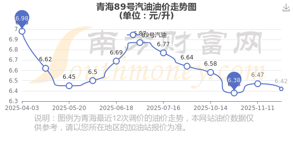 12月7日,青海89号汽油的最新价格为6.42元/升,是11月25日调整后的价格,对比上次油价调整降了0.05元,降0.773%。
