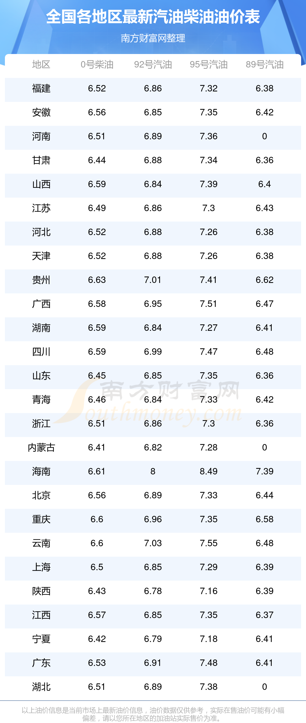 以上油价信息是当前市场上最新油价信息,油价数据仅供参考,实际在售油价可能有小幅偏差,请以您所在地区的加油站实际售价为准。
