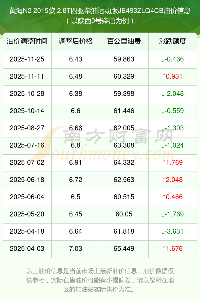 根据11月25日0号柴油最新调整价格6.43元/升来计算(以陕西为例),该车型每百公里的平均油费是59.863元,上一轮11月11日调整价格6.48元每升来计算,每百公里的平均油费是60.329元,对比上一轮少花0.466元,下一轮的油价调整时间是12月8日24时。