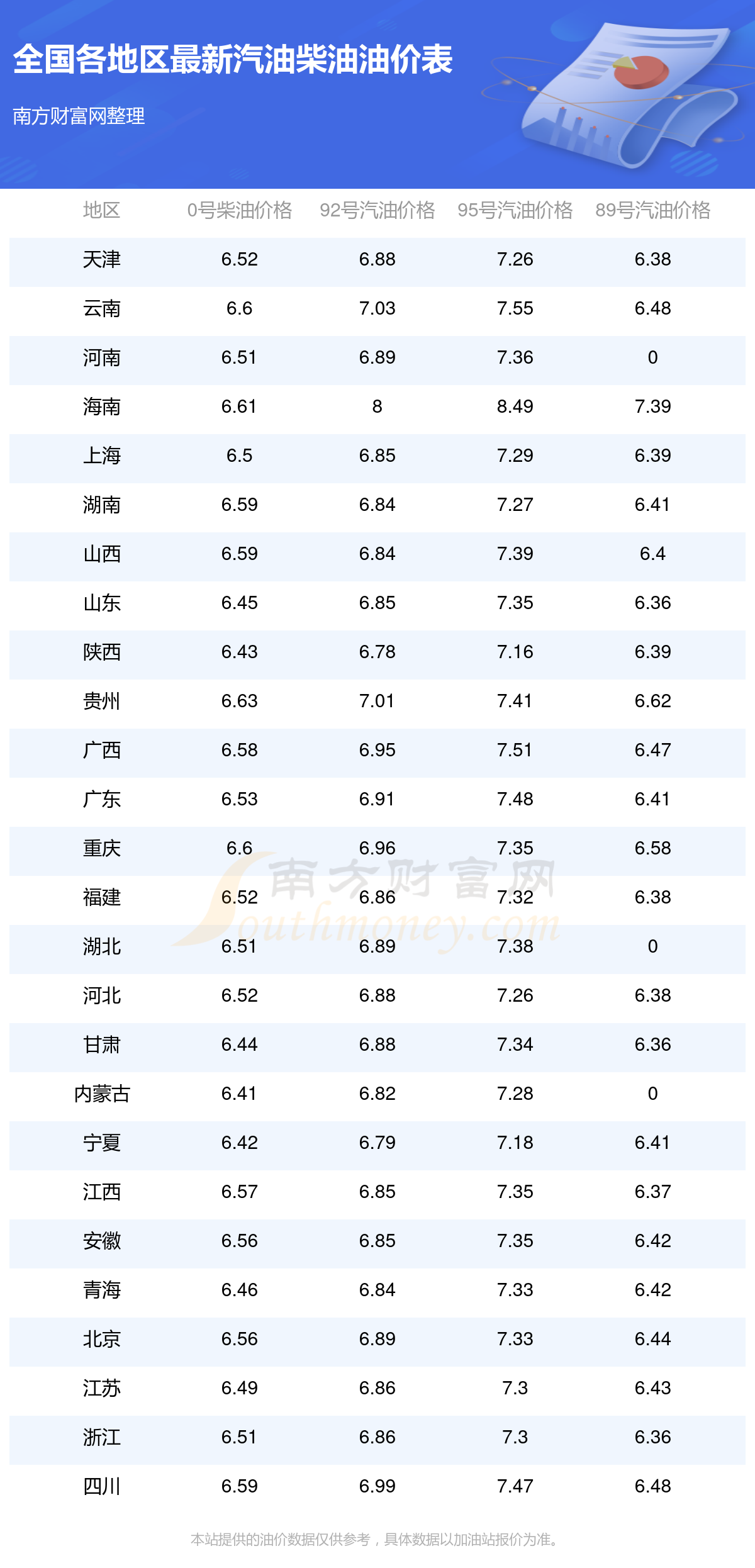 2025年12月7日全国各地油价调整及最新汽油价格表