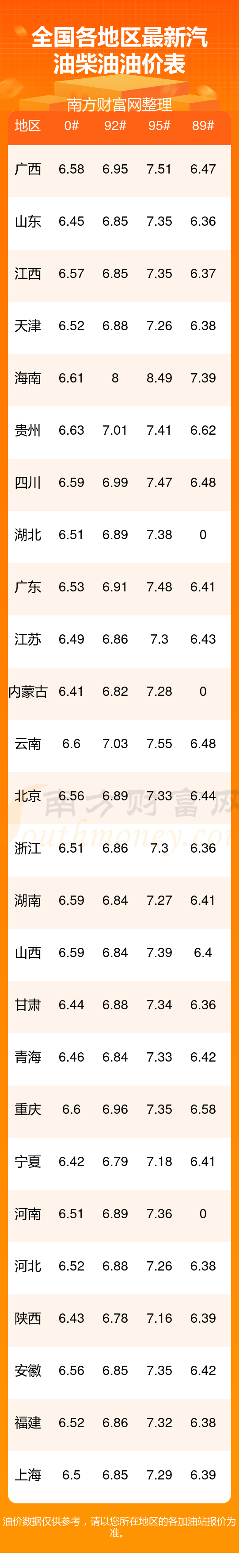 全国95号汽油平均价格为:7元每升,其中,最低为陕西,价格7.16元/升,最高为海南,价格8.49元/升。