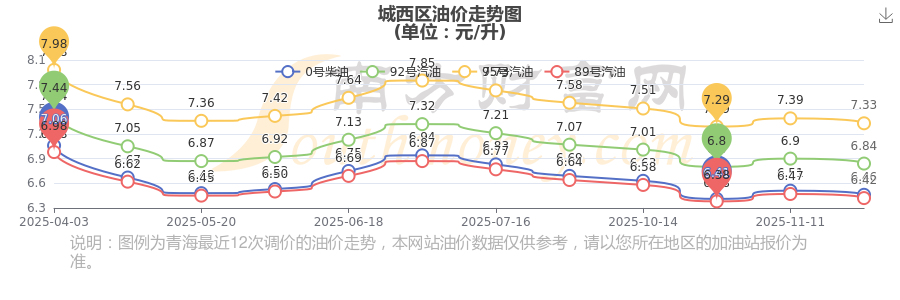 12月7日,城西区汽油、柴油价格多少钱一升?具体为:11月25日调整后,92号汽油为6.84元,下调了0.06元,下调幅达0.87%;95号汽油为7.33元,下调了0.06元,下调幅达0.81%;89号汽油为6.42元,下调了0.05元,下调幅达0.77%;0号柴油为6.46元,下调了0.05元,下调幅达0.77%。