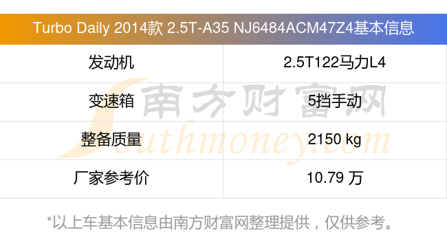 在动力上,Turbo Daily 2014款 2.5T-A35 NJ6484ACM47Z4配备的是一台2.5T122马力L4涡轮增压发动机,匹配的是5挡手动挡变速箱,燃料形式为柴油,常规整备质量2150kg,厂家参考价10.79万元。