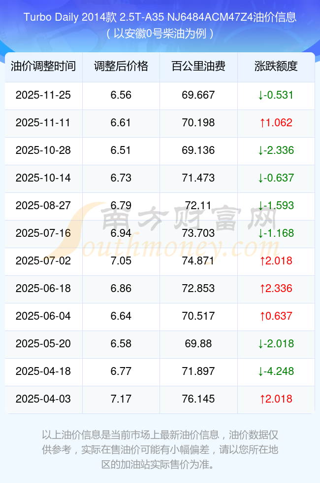 依照11月25日0号柴油最新调整价格6.56元/升来计算(以安徽为例),该车型百公里的平均油费是69.667元,依照上一轮11月11日调整价格6.61元/升来计算,百公里的平均油费是70.198元,对比上一轮少花0.531元,下一轮的油价调整时间12月8日24时。