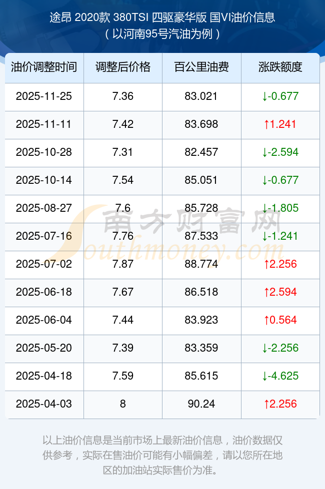 按11月25日95号汽油最新调整价格7.36元每升来计算(以河南为例),该车型百公里平均油费为83.021元,按上一轮11月11日调整价格7.42元每升来计算,百公里平均油费为83.698元,对比上一轮少花0.677元,下一轮油价调整时间为12月8日24时。