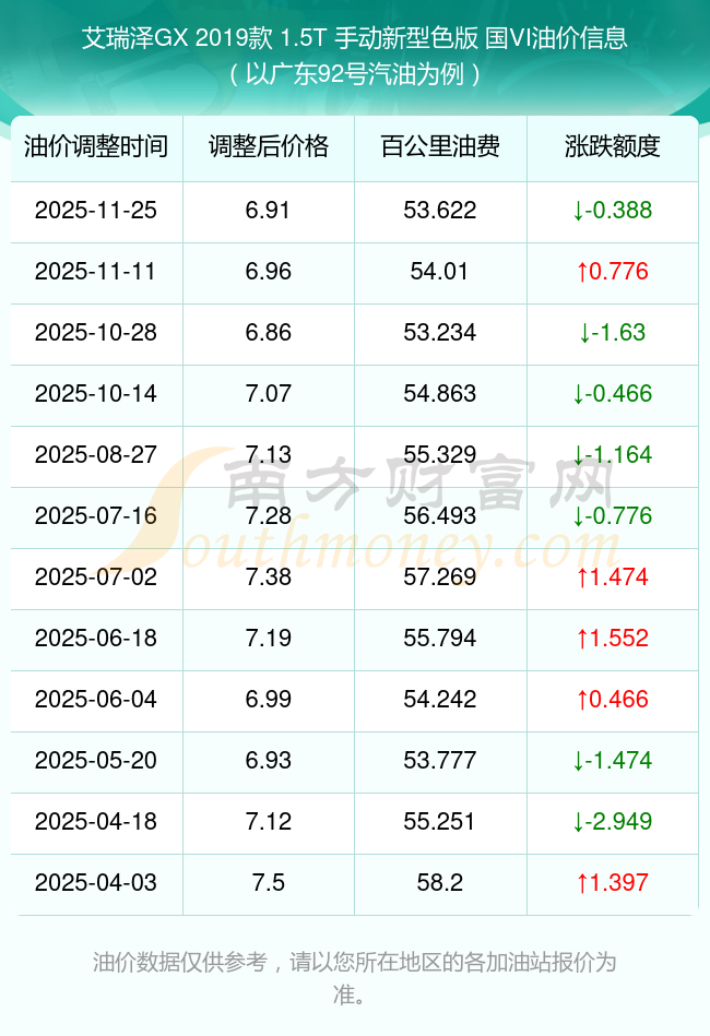 按照11月25日92号汽油最新调整价格6.91元/升来计算(以广东为例),该车型百公里平均油费为53.622元,按照上一轮11月11日调整价格6.96元/升来计算,百公里平均油费为54.01元,对比上一轮少花0.388元,下一轮油价调整时间为12月8日24时。