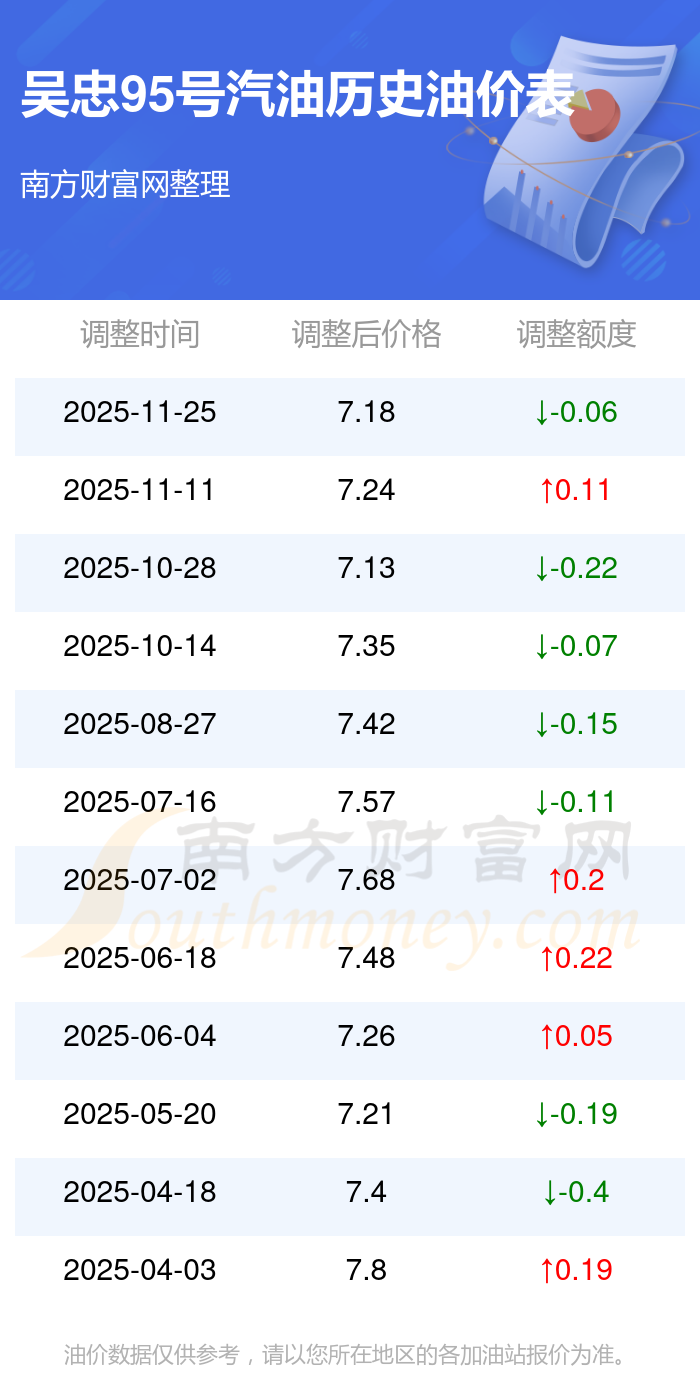吴忠95号汽油12月7日的价格为7.18元/升,本次油价的调整时间为11月25日,对比上次油价调整时间11月11日的价格7.24元/升,共下调了0.06元,下调幅达0.829%。下一轮油价调整时间12月8日24时,距离现在还有1.21天。