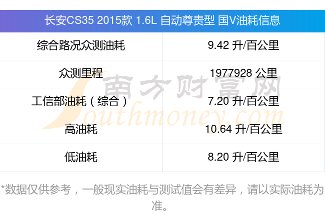 根据车主实测数据,该车型低油耗为8.20升/百公里,高油耗为10.64升/百公里,综合路况众测油耗为9.42升/百公里,工信部综合油耗为7.20升/百公里。