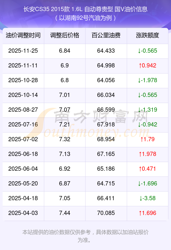 按11月25日92号汽油最新调整价格6.84元每升来计算(以湖南为例),该车型百公里平均油费为64.433元,按上一轮11月11日调整价格6.9元每升来计算,百公里平均油费为64.998元,对比上一轮少花0.565元,下一轮油价调整时间为12月8日24时。