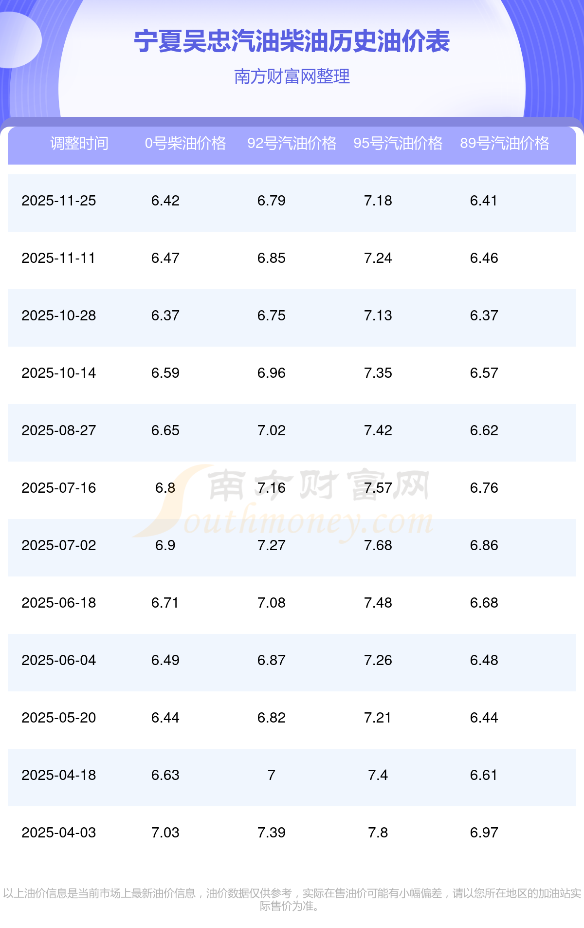 宁夏吴忠汽油、柴油12月7日每升的价格为(油价调整时间是11月25日):92号汽油6.79元;95号汽油7.18元;89号汽油6.41元;0号柴油6.42元。
