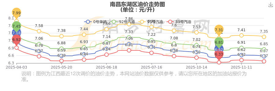 12月7日南昌东湖区汽油、柴油价格是11月25日调整后的价格,每升价格具体为:92号汽油为6.85元,下调了0.06元,下调幅达0.87%;95号汽油为7.35元,下调了0.06元,下调幅达0.81%;89号汽油为6.37元,下调了0.05元,下调幅达0.78%;0号柴油为6.57元,下调了0.05元,下调幅达0.76%。