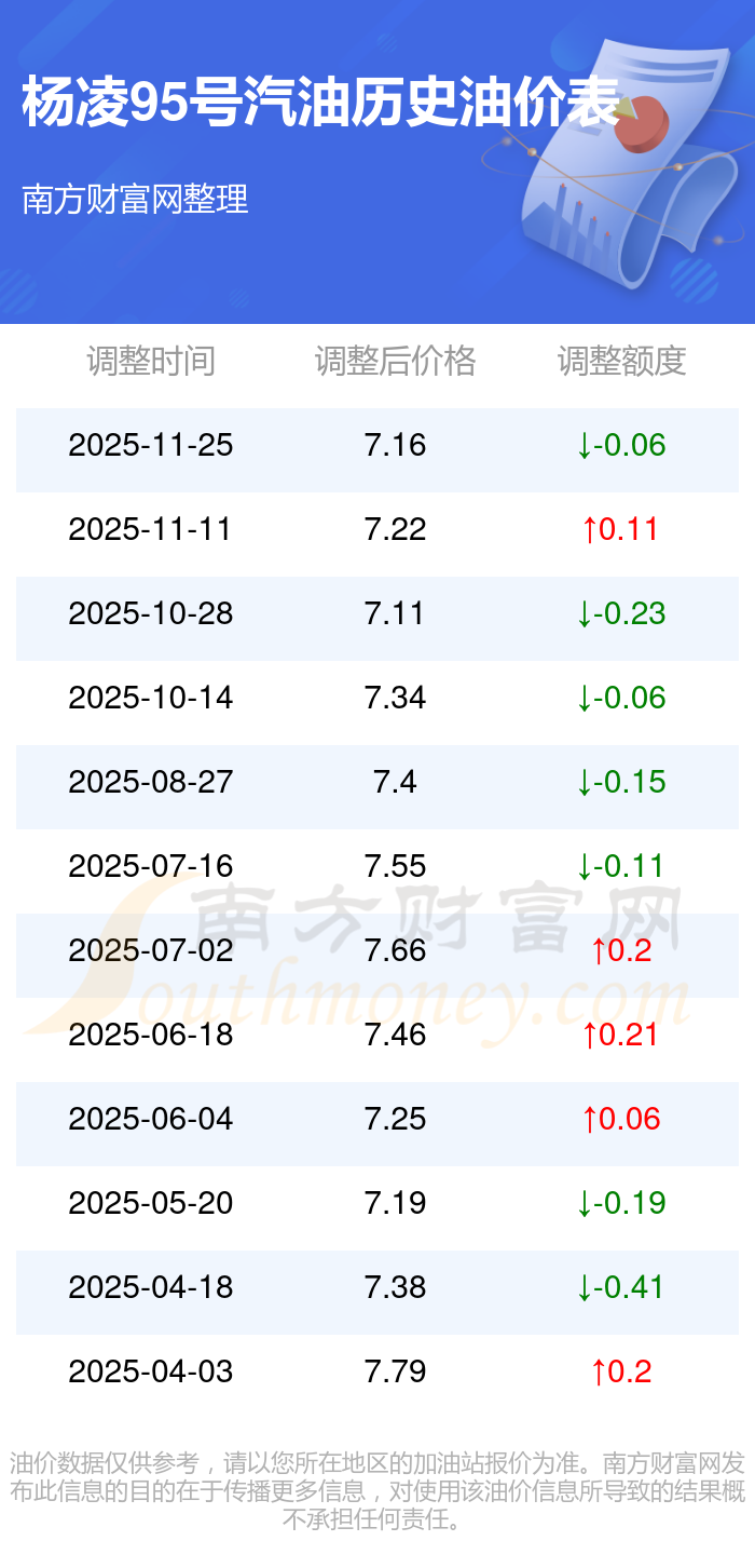 杨凌95号汽油12月7日的最新价格(11月25日油价调整后的价格):杨凌95号汽油7.16元/升,相对上次调整时间11月11日的油价7.22元每升,减了0.06元,减0.831%。下一轮油价调整时间12月8日24时,距离现在还有1.19天。