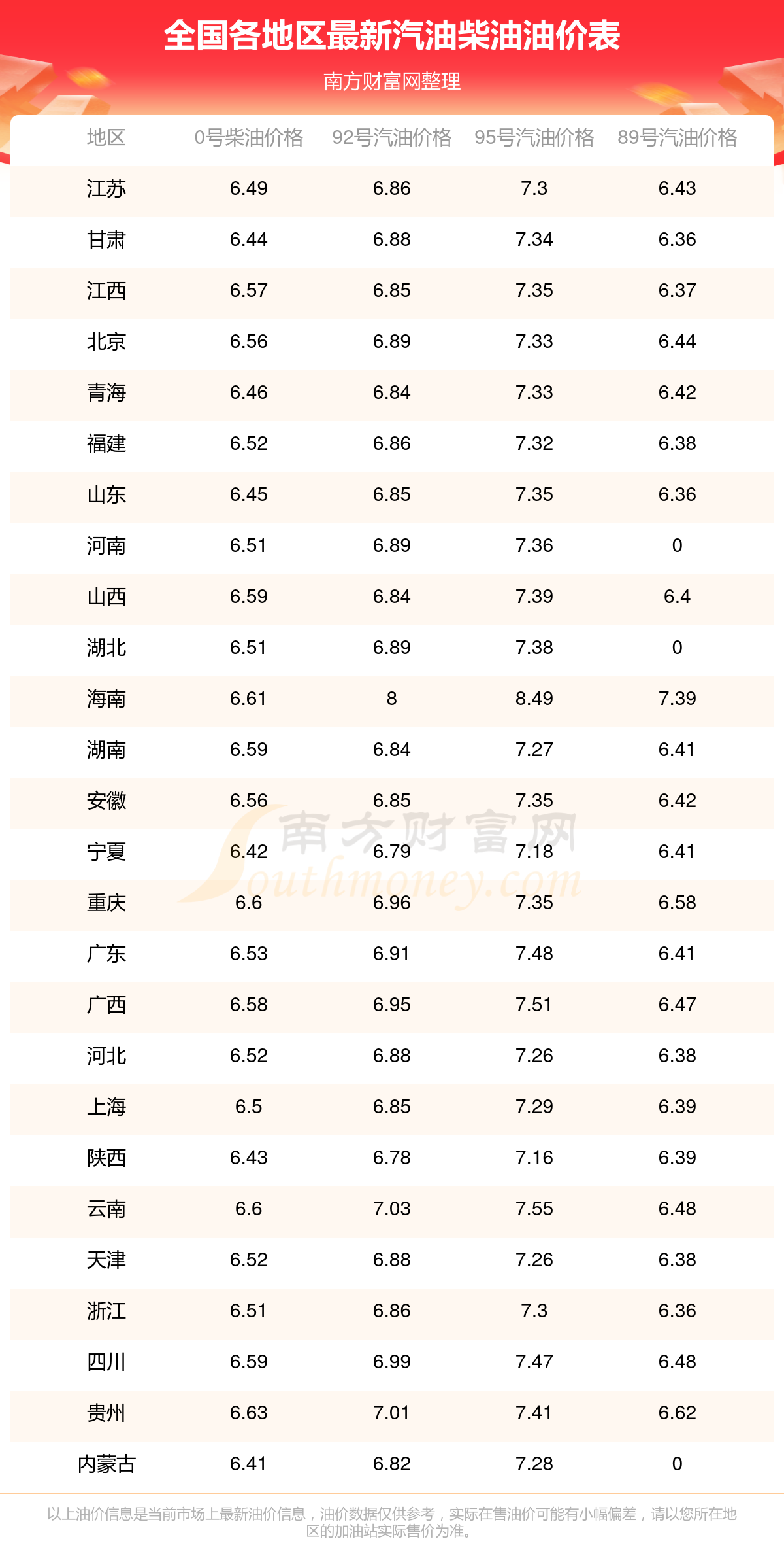 油价数据仅供参考,请以您所在地区的加油站报价为准。南方财富网发布此信息的目的在于传播更多信息,对使用该油价信息所导致的结果概不承担任何责任。