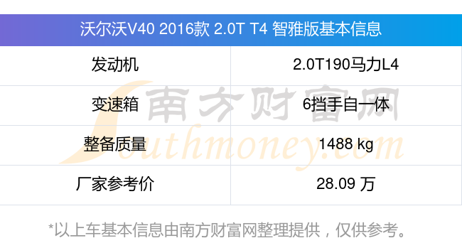 在动力上,沃尔沃V40 2016款 2.0T T4 智雅版配备的是一台2.0T190马力L4涡轮增压发动机,匹配的是6挡手自一体自动档变速箱,燃料形式为汽油,常规整备质量1488kg,厂家参考价28.09万元。