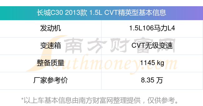 长城C30 2013款 1.5L CVT精英型动力方面,搭载的是一台1.5L106马力L4自然吸气发动机,匹配CVT无级变速自动档变速箱,燃料形式为汽油,常规整备质量1145kg,厂家参考价8.35万元。