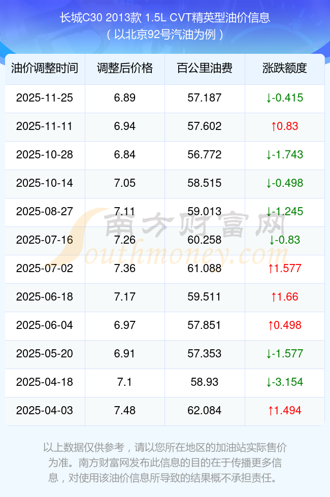 按11月25日92号汽油最新调整价格6.89元每升来计算(以北京为例),该车型百公里平均油费为57.187元,按上一轮11月11日调整价格6.94元每升来计算,百公里平均油费为57.602元,对比上一轮少花0.415元,下一轮油价调整时间为12月8日24时。