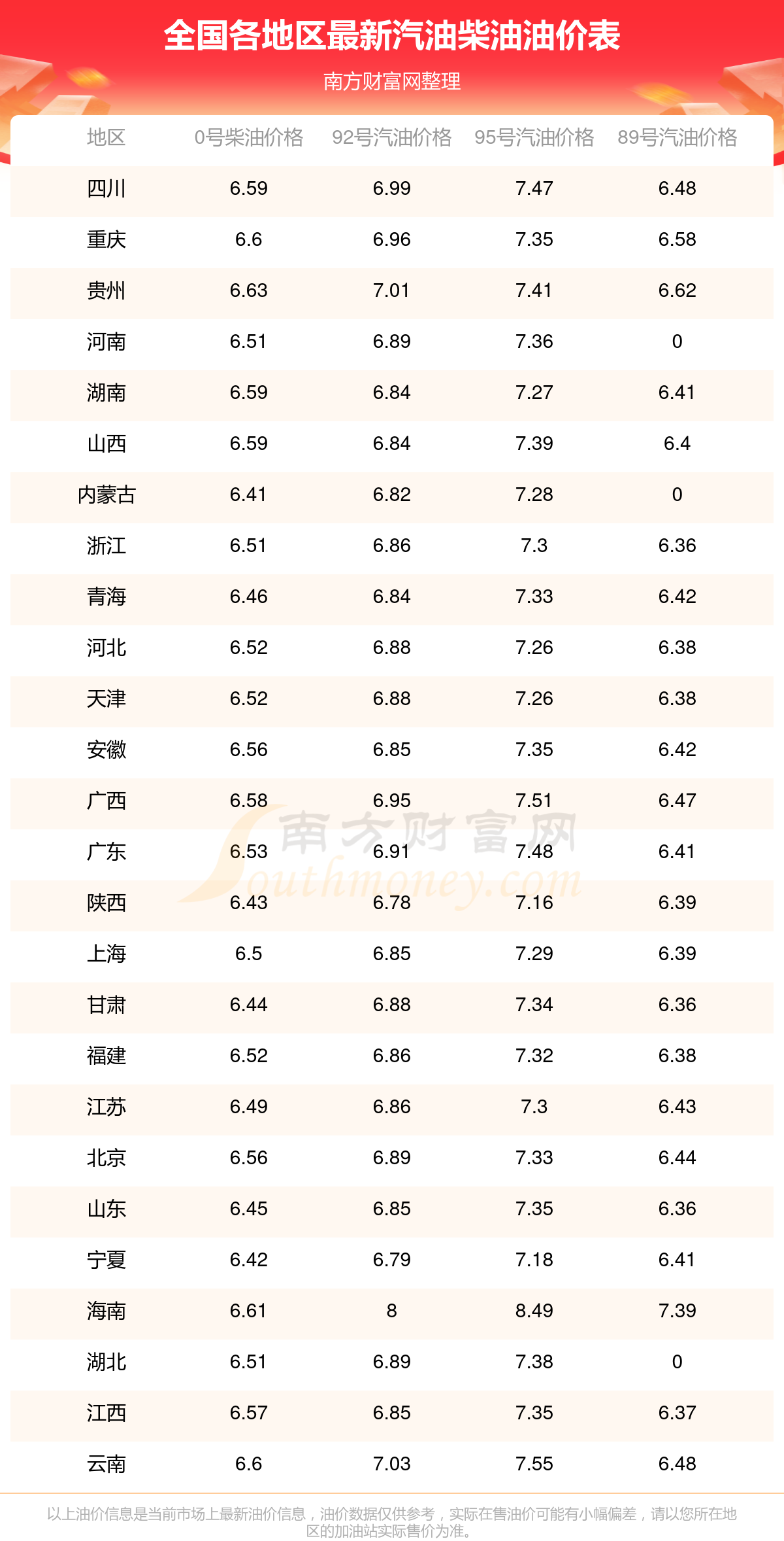 以上数据仅供参考,请以您所在地区的加油站实际售价为准。南方财富网发布此信息的目的在于传播更多信息,对使用该油价信息所导致的结果概不承担责任。