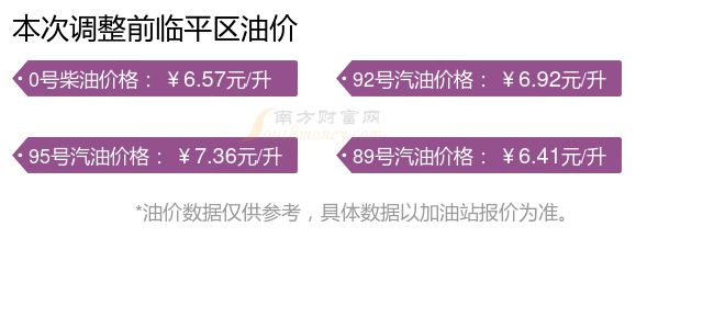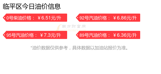 临平区汽油、柴油12月7日每升最新价格:92号汽油为6.86元;95号汽油为7.3元;89号汽油为6.36元;0号柴油为6.51元,本轮油价调整时间为11月25日。下一轮油价调整时间12月8日24时。