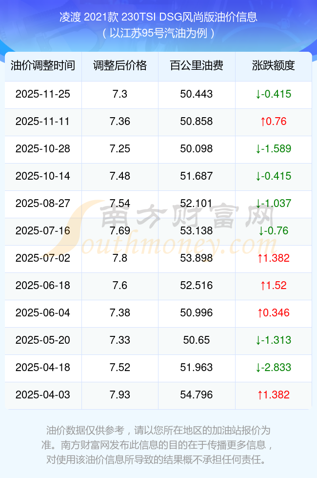 按照11月25日95号汽油最新调整价格7.3元/升来计算(以江苏为例),该车型百公里平均油费为50.443元,按照上一轮11月11日调整价格7.36元/升来计算,百公里平均油费为50.858元,对比上一轮少花0.415元,下一轮油价调整时间为12月8日24时。