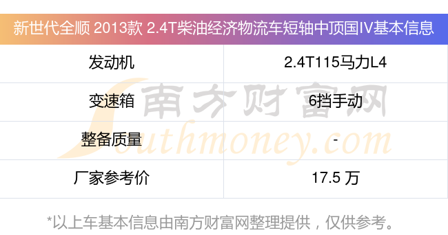 新世代全顺 2013款 2.4T柴油经济物流车短轴中顶国IV搭载了一台2.4T115马力L4涡轮增压发动机,采用6挡手动挡变速箱,厂家参考价17.5万元。