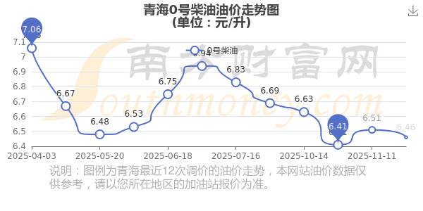 12月7日,青海0号柴油的价格是6.46元每升,本次的调整时间为11月25日,对比上次的调整降了0.05元,降0.768%,12月8日24时为下一轮油价调整时间,还有1.13天。