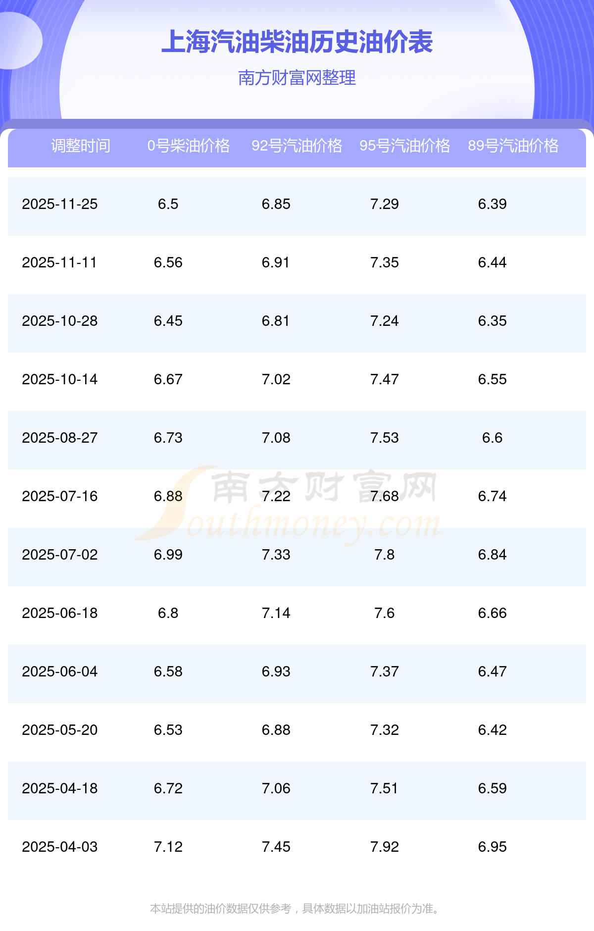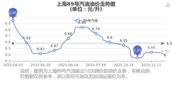 上海汽油、柴油12月7日每升的价格是多少?11月25日调整后的价格详情如下:92号汽油6.85元;95号汽油7.29元;89号汽油6.39元;0号柴油6.5元。