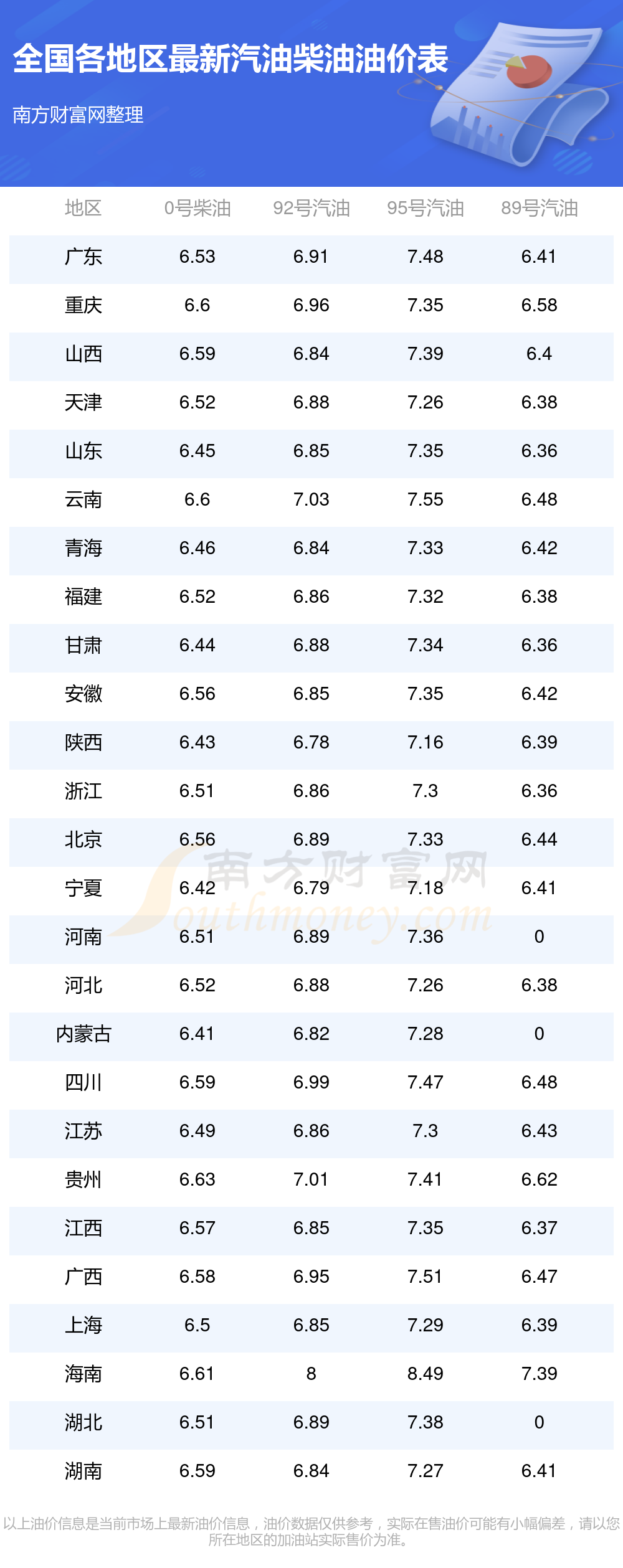 以上数据仅供参考,请以您所在地区的加油站实际售价为准。南方财富网发布此信息的目的在于传播更多信息,对使用该油价信息所导致的结果概不承担责任。