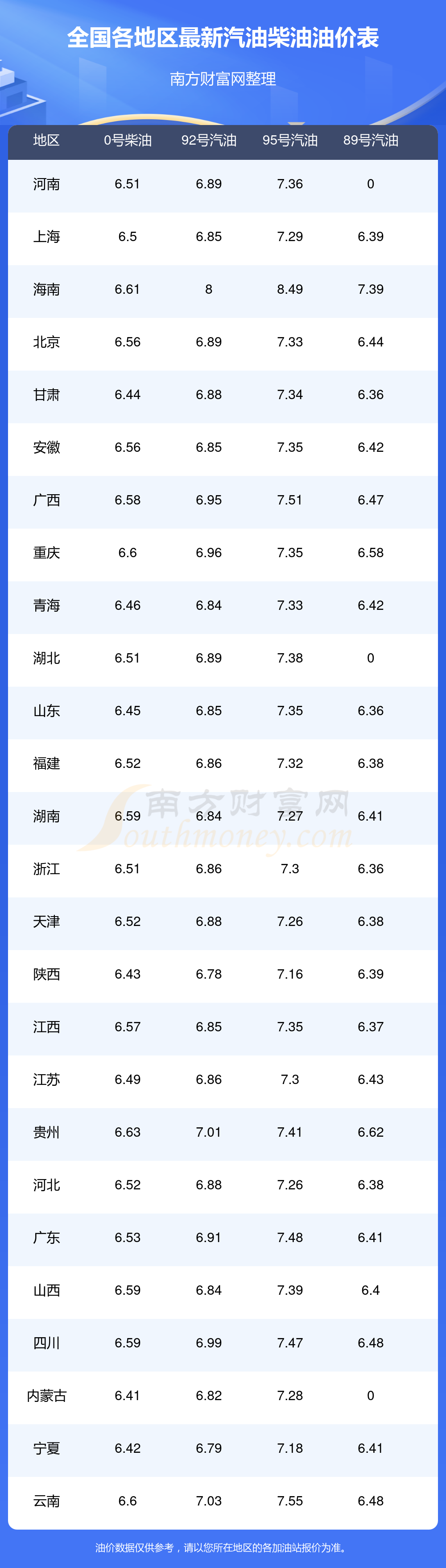 油价数据仅供参考,请以您所在地区的加油站报价为准。南方财富网发布此信息的目的在于传播更多信息,对使用该油价信息所导致的结果概不承担任何责任。