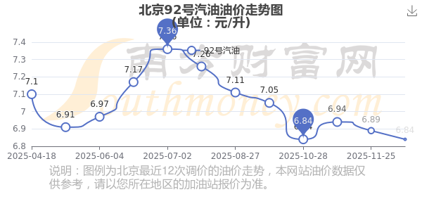 汽油价格调整最新消息:下一轮油价调整时间12月22日24时。12月13日北京汽油、柴油每升的价格具体为:本轮油价调整时间为12月9日,92号汽油是6.84元,降了0.05元,降幅达0.73%;95号汽油是7.28元,降了0.05元,降幅达0.68%;89号汽油为6.4元,降了0.04元,降幅达0.62%;0号柴油为6.52元,降了0.04元,降幅达0.61%。