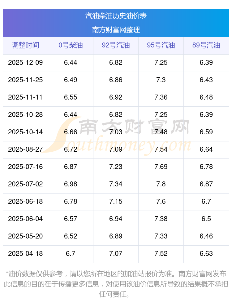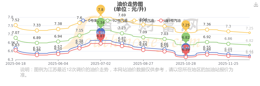 12月13日,江苏宿迁92号汽油价格为每升6.82元,这是12月9日油价调整后的价格,相对上次调整时间11月25日的油价6.86元每升,跌了0.04元,跌0.583%。下一轮油价调整时间12月22日24时,距离现在还有9.22天。
