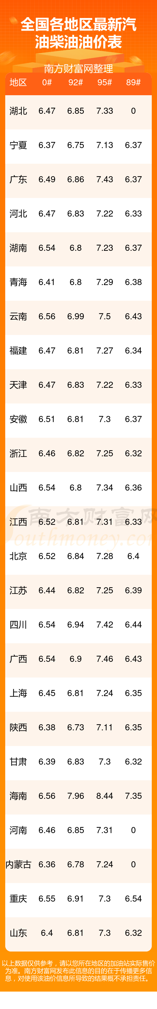 全国各地区最新油价表