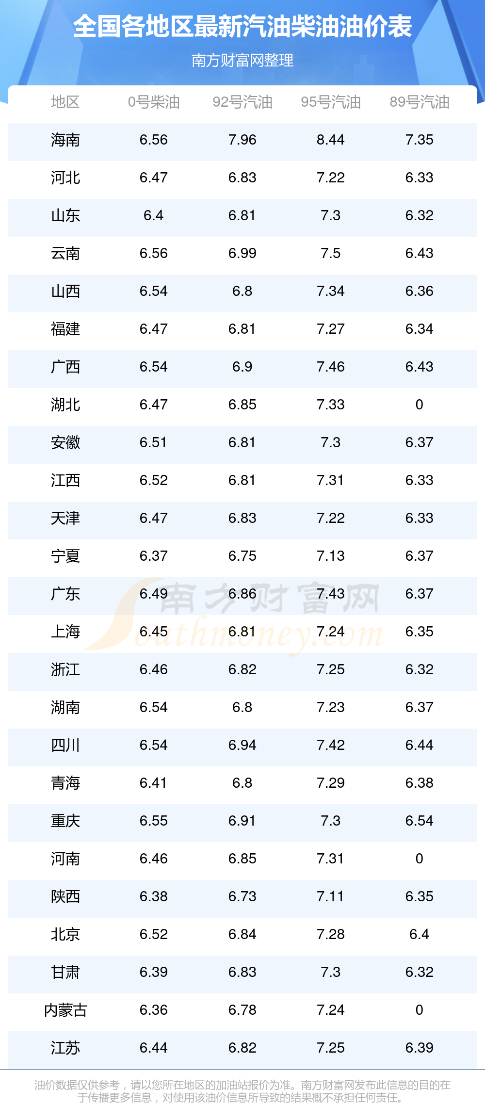 油价数据仅供参考,请以您所在地区的加油站报价为准。南方财富网发布此信息的目的在于传播更多信息,对使用该油价信息所导致的结果概不承担任何责任。
