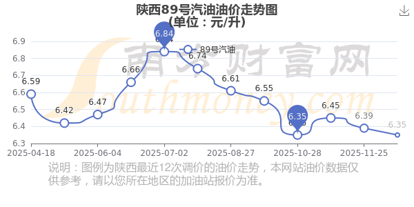 陕西汽油、柴油12月13日每升最新价格为12月9日调整后的价格,92号汽油为6.73元,下调了0.05元;95号汽油为7.11元,下调了0.05元;89号汽油为6.35元,下调了0.04;0号柴油为6.38元,下调了0.05元。