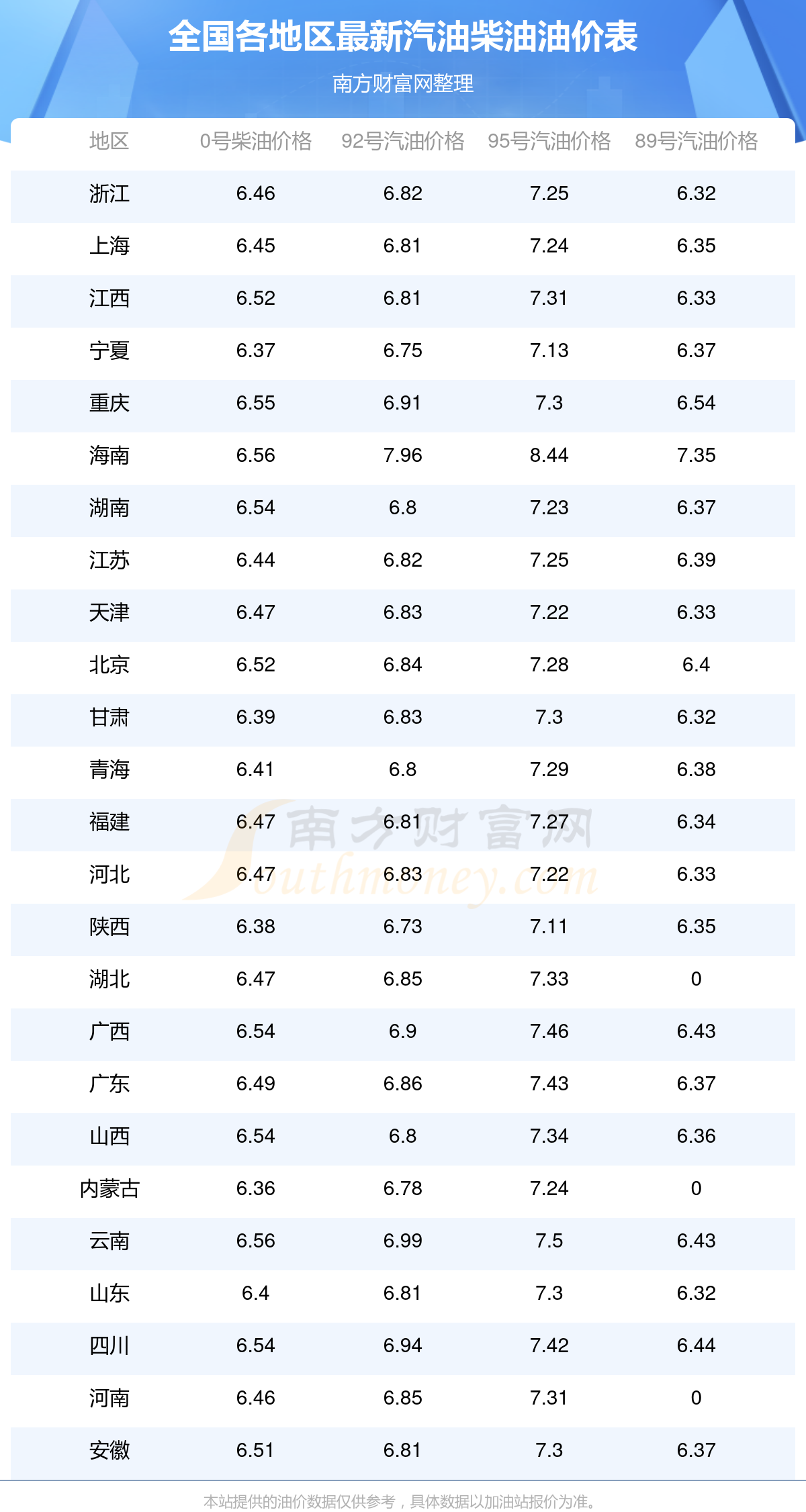 以上数据仅供参考,请以您所在地区的加油站实际售价为准。南方财富网发布此信息的目的在于传播更多信息,对使用该油价信息所导致的结果概不承担责任。
