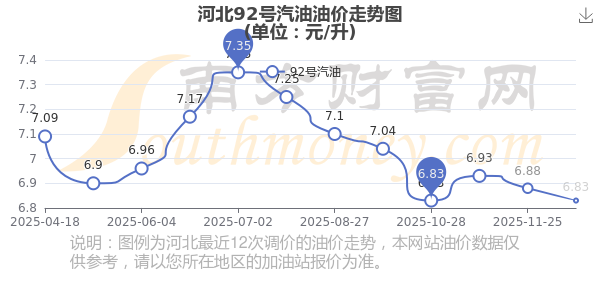 12月13日,河北92号汽油的价格是6.83元每升,本次的调整时间为12月9日,对比上次的调整下调了0.05元,下调0.727%,12月22日24时为下一轮油价调整时间,还有9.19天。
