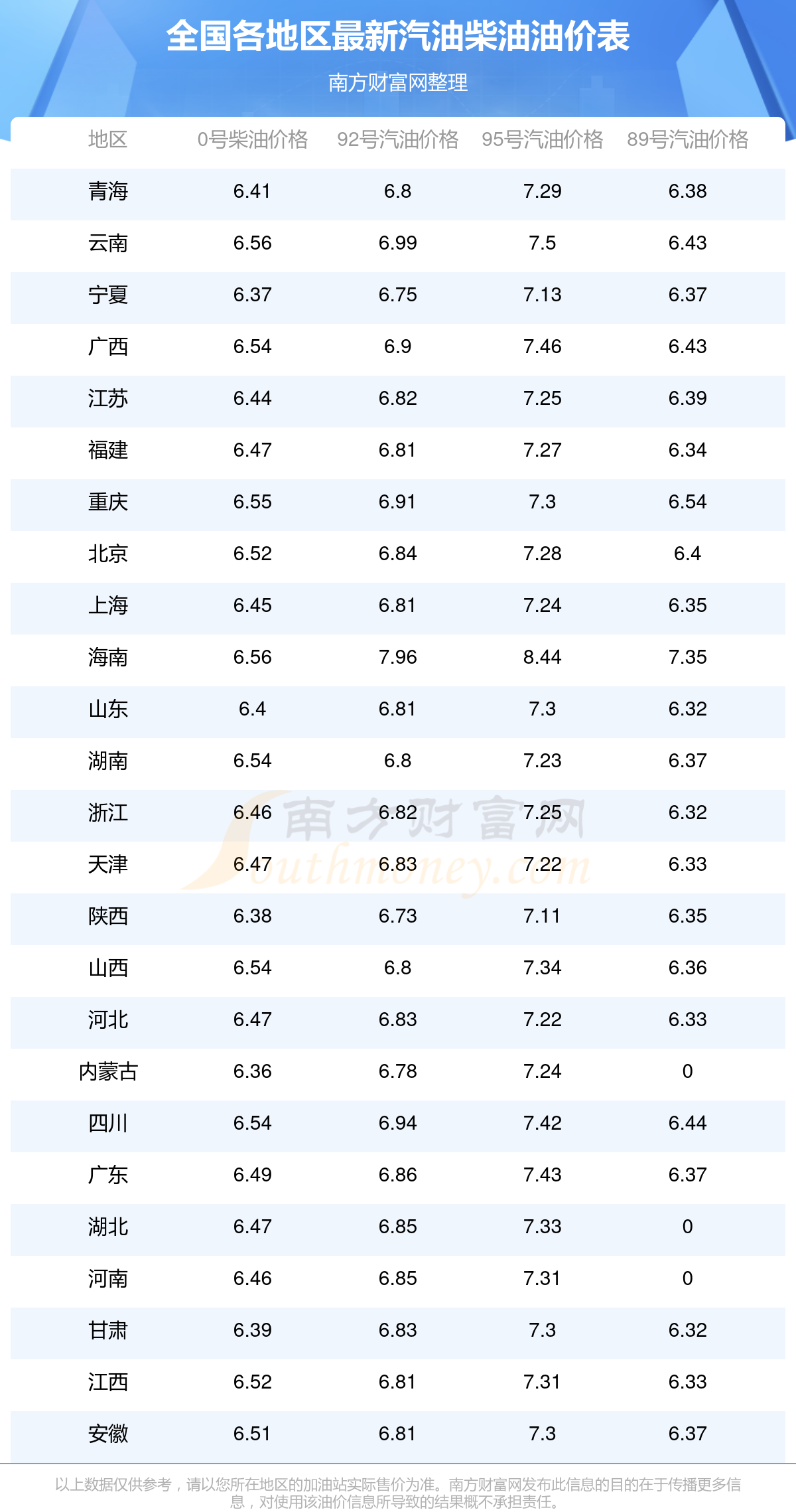 油价数据仅供参考,请以您所在地区的加油站报价为准。南方财富网发布此信息的目的在于传播更多信息,对使用该油价信息所导致的结果概不承担任何责任。