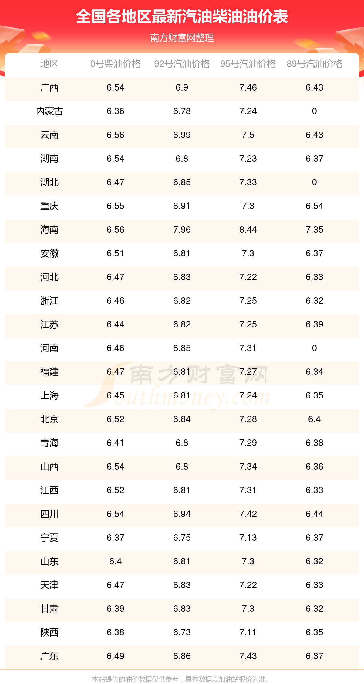 全国0号柴油最新平均价格为:6元每升,其中,最高为海南,价格为6.56元/升,最低为内蒙古,价格为6.36元/升。
