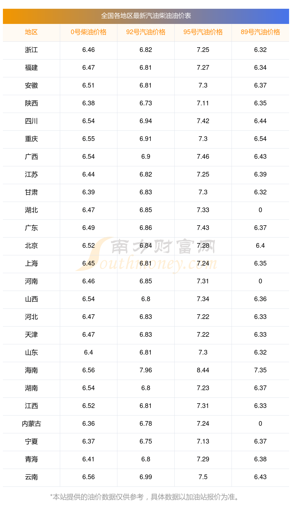 油价数据仅供参考,请以您所在地区的加油站报价为准。南方财富网发布此信息的目的在于传播更多信息,对使用该油价信息所导致的结果概不承担任何责任。