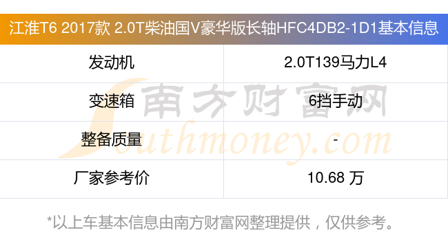 江淮T6 2017款 2.0T柴油国V豪华版长轴HFC4DB2-1D1动力上配备的是一台2.0T139马力L4涡轮增压发动机,匹配的是6挡手动挡变速箱,燃料形式为柴油,厂家参考价10.68万元。