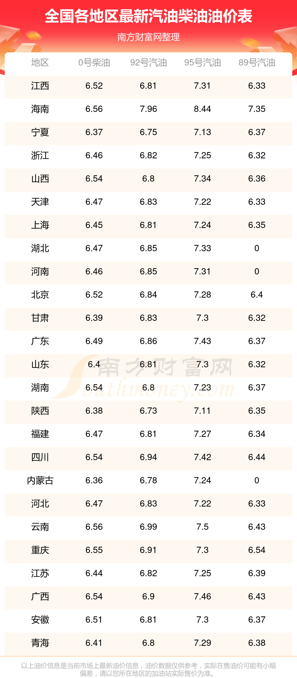 油价数据仅供参考,请以您所在地区的加油站报价为准。南方财富网发布此信息的目的在于传播更多信息,对使用该油价信息所导致的结果概不承担任何责任。